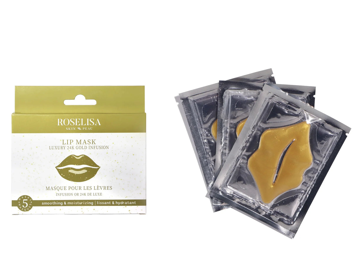Notre masque à lèvres Roselisa Luxury 24K Gold (lot de 5) est un masque en tissu hydratant qui stimule la production de collagène. Ce masque affine et hydrate progressivement les lèvres ternes, gercées et sèches, pour un résultat glamour. Il sert également de base lissante pour tous vos rouges à lèvres. À appliquer sur des lèvres propres pendant 15 à 20 minutes. Facile à utiliser et non irritant.
